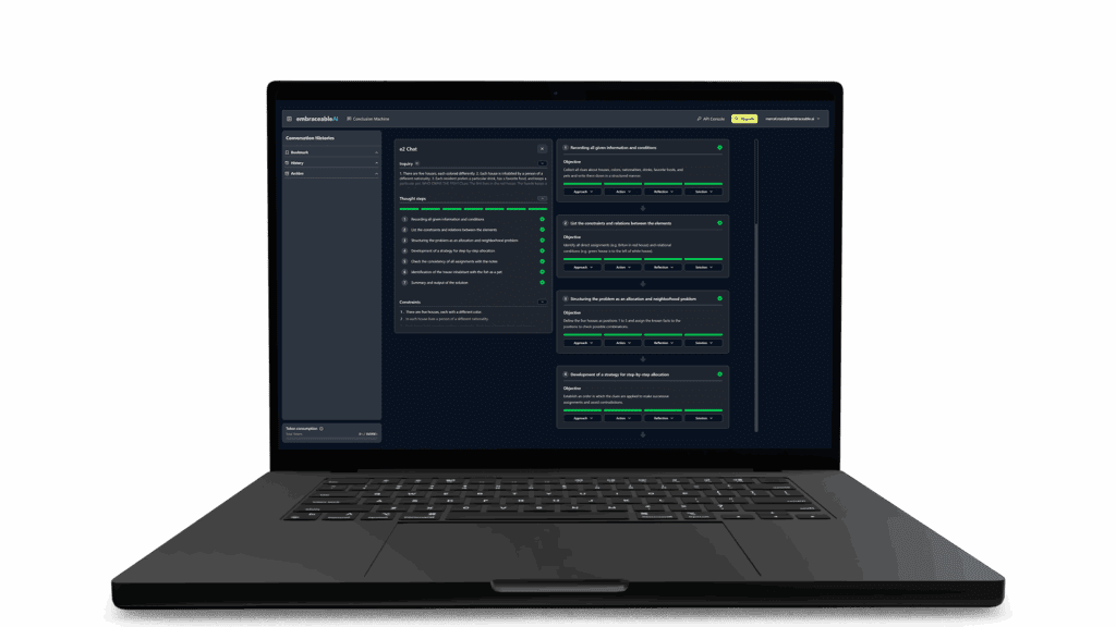 Heutigen Modellen fehlt die funktionale Denk-Ebene — also die Fähigkeit, Informationen nicht nur als Wortfolgen, sondern als strukturierte Gedanken mit Bedeutung und Zusammenhang zu verarbeiten. Wir fügen diese Ebene hinzu — und schaffen damit eine neue Modellklasse: Cognitive Conclusion Models (CCMs). Das strukturiert und stabilisiert den Denkprozess — er wird belastbar genug für Kernprozesse. Banken, Versorger und Industrie setzen CCM-Technologie bereits ein — und überwinden damit den Value Gap.