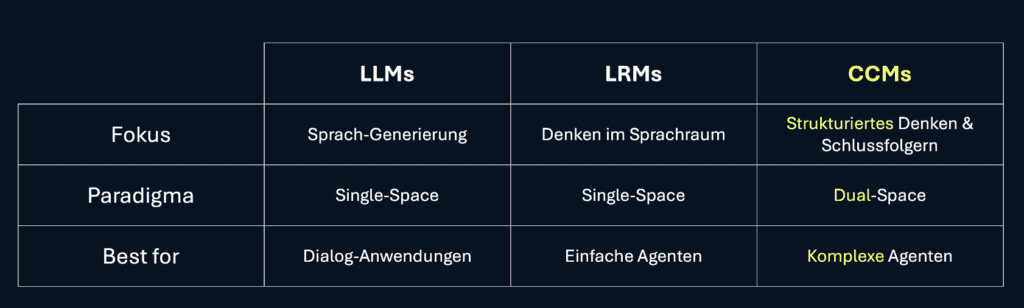 CCMs haben diese funktionale Denk-Ebene — und zwar als integralen Teil ihrer Architektur. Damit schließen wir den Value Gap KI wird strukturell belastbar genug für Agentic AI in realen, anspruchsvollen Prozessen.