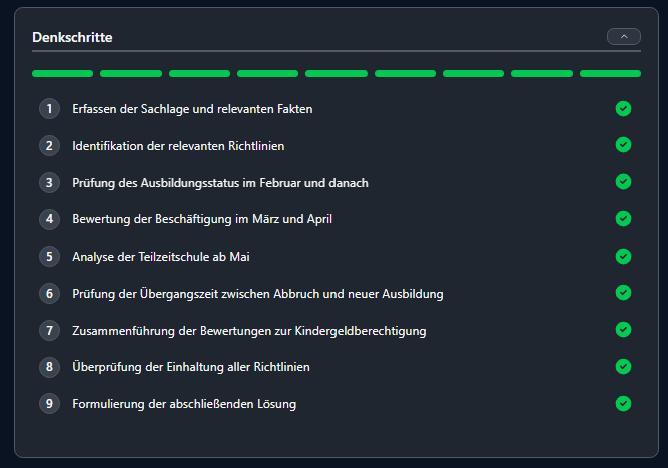 Die Aufgabe erfordert eine präzise Prüfung von Anspruchszeiträumen gegen eine komplexe Policy-Logik (Ausbildung, Übergangszeiten, Ausnahmen). Solche Aufgaben lassen sich prinzipiell auch mit klassischen Sprachmodellen lösen – allerdings nur mit umfangreichen, manuell entwickelten Guardrails, Spezial-Prompts und zusätzlicher Logik, die fachlich gepflegt, geprüft und kontinuierlich angepasst werden müssen.